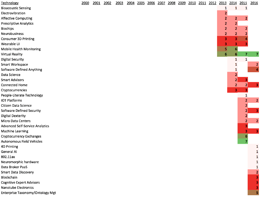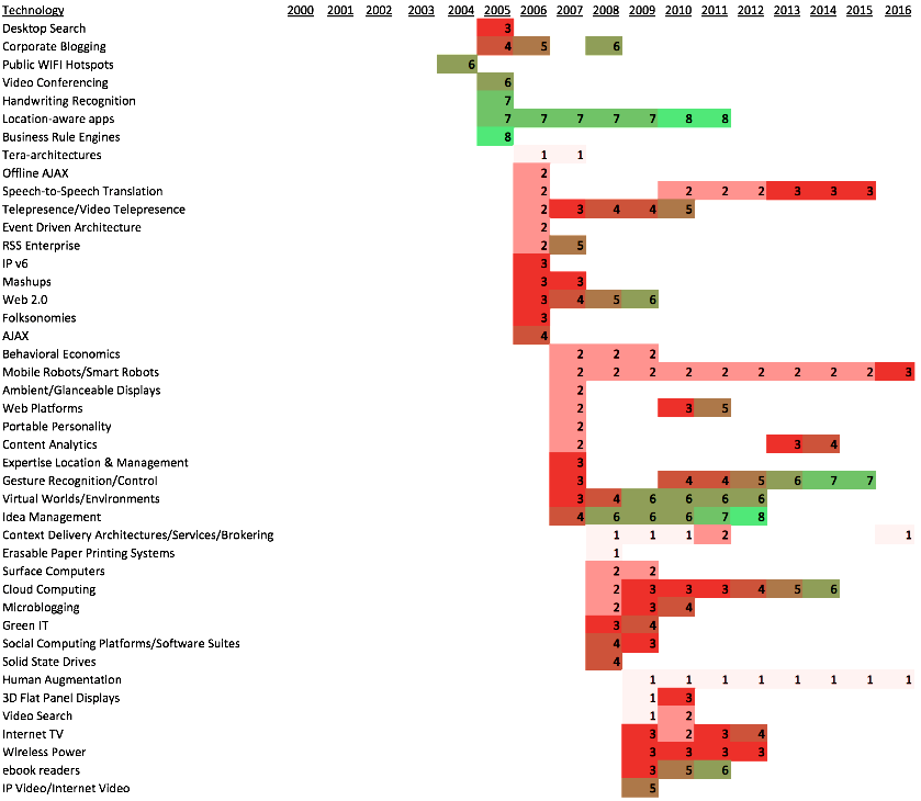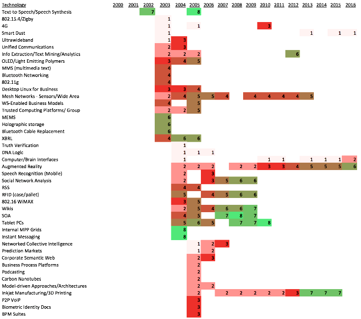 تمامی فناوری های ذکر شده در حدود ۲۰ سال از فعالیت این سازمان به صورت مراحل قرار گیری (از ۱تا ۸ نمودار فوق) هر یک از این فناوری ها در سال های مختلف به صورت تحلیلی ذکر می گردد.